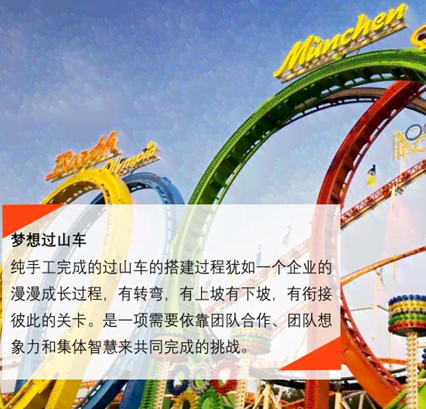 純手工完成的過山車的搭建過程猶如一個企業(yè)的漫漫成長過程,有轉(zhuǎn)彎,有上坡有下坡,有銜接彼此的關(guān)卡。是一項需要依靠團隊合作、團隊想象力和集體智慧來共同完成的挑戰(zhàn)。